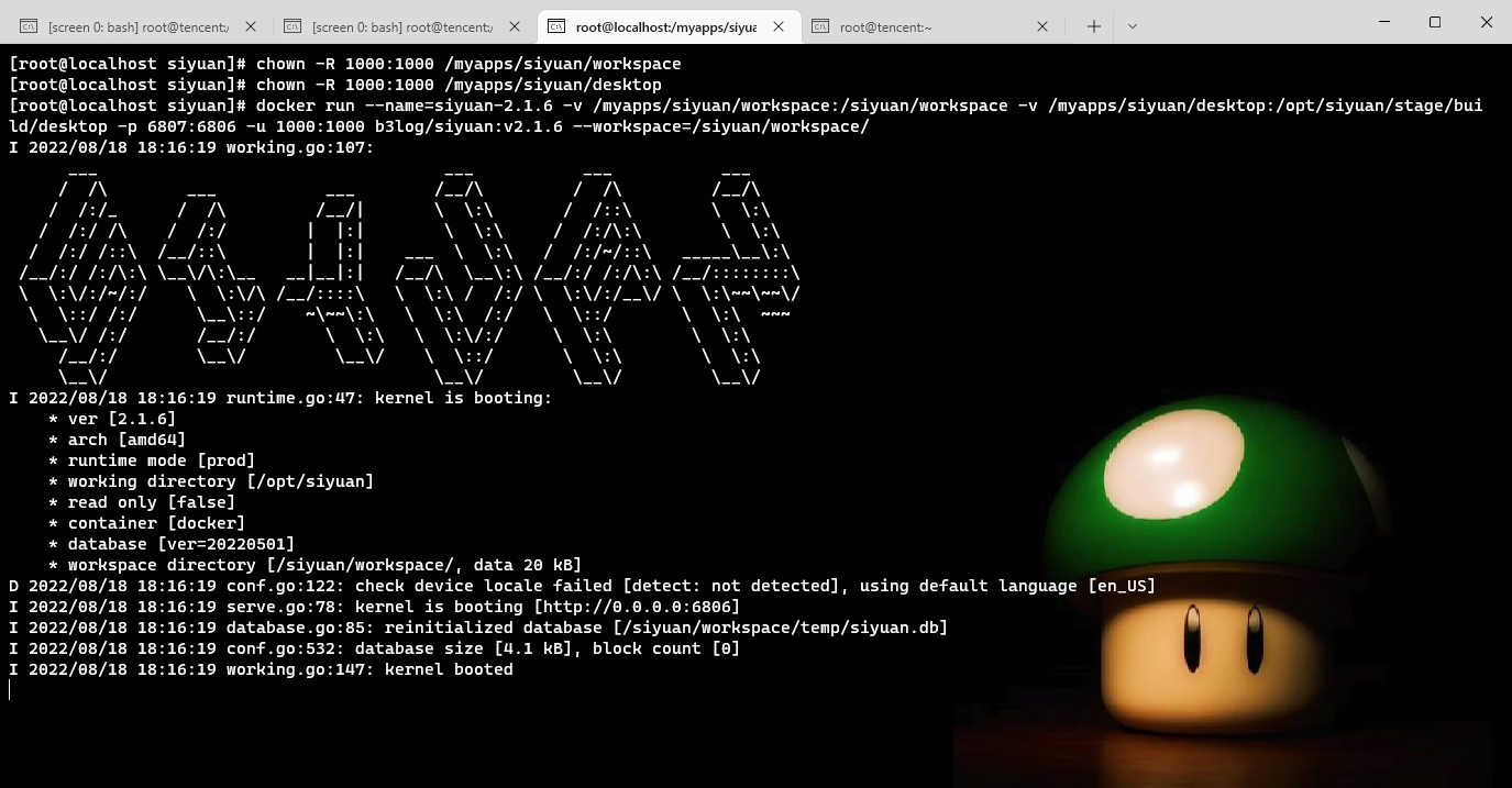 docker run --name=siyuan -u 1000:1000 b3log/siyuan:v2.1.6 --workspace=/siyuan/workspace/