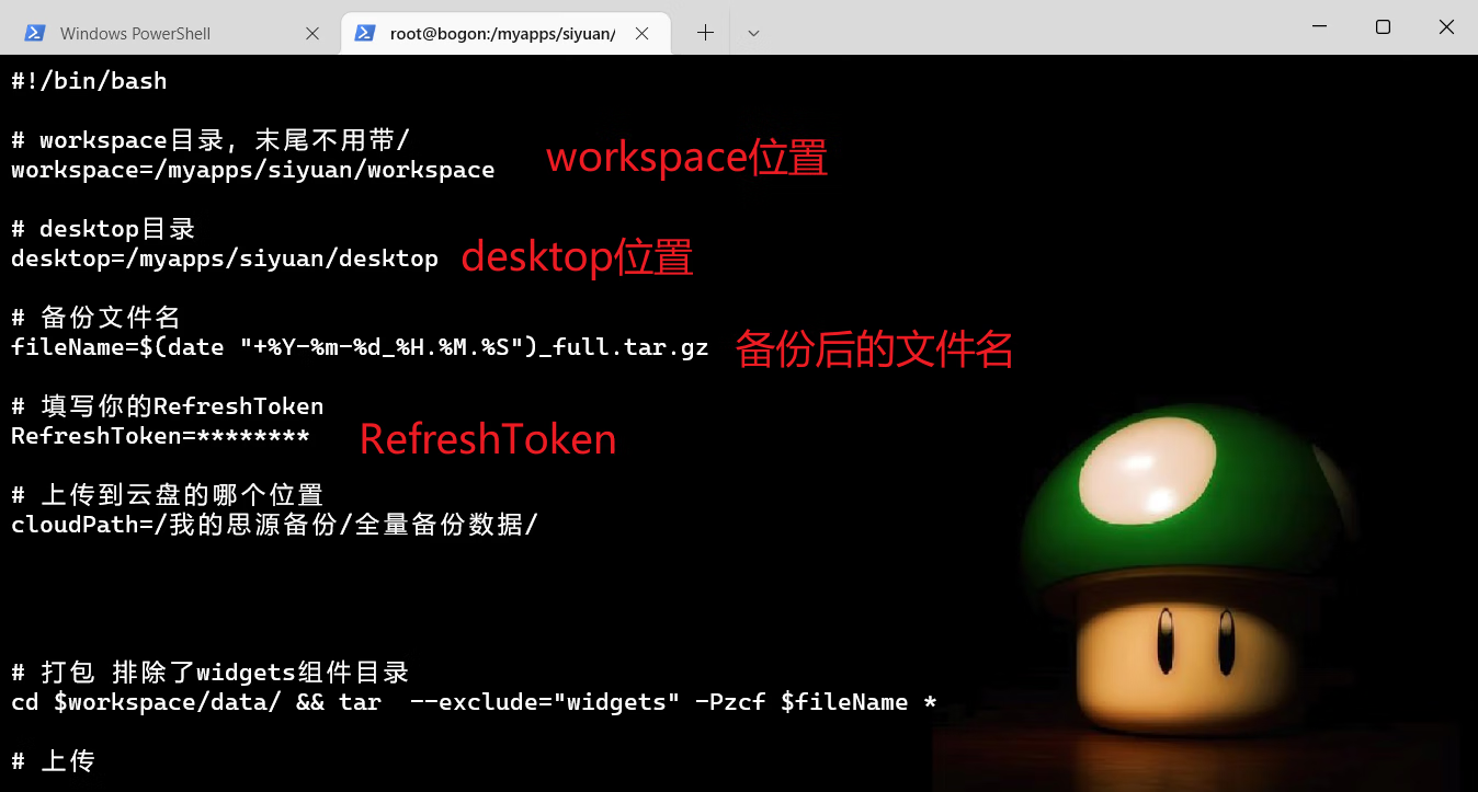 编辑`backup.sh`,如果你之前没有对映射位置做过自定义的修改,那么这里只需要填写RefreshToken