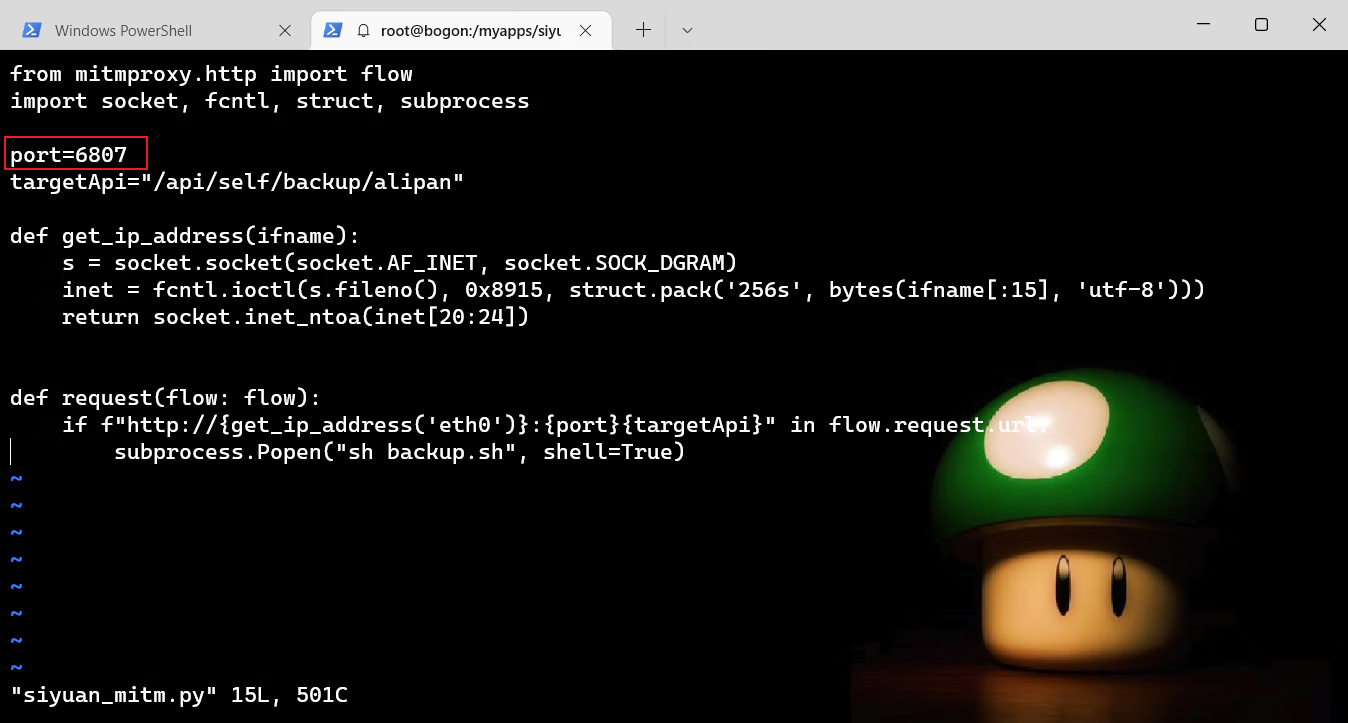 编辑`siyuan_mitm.py`,如果你设置的端口也是6807,则此处不需要做任何修改