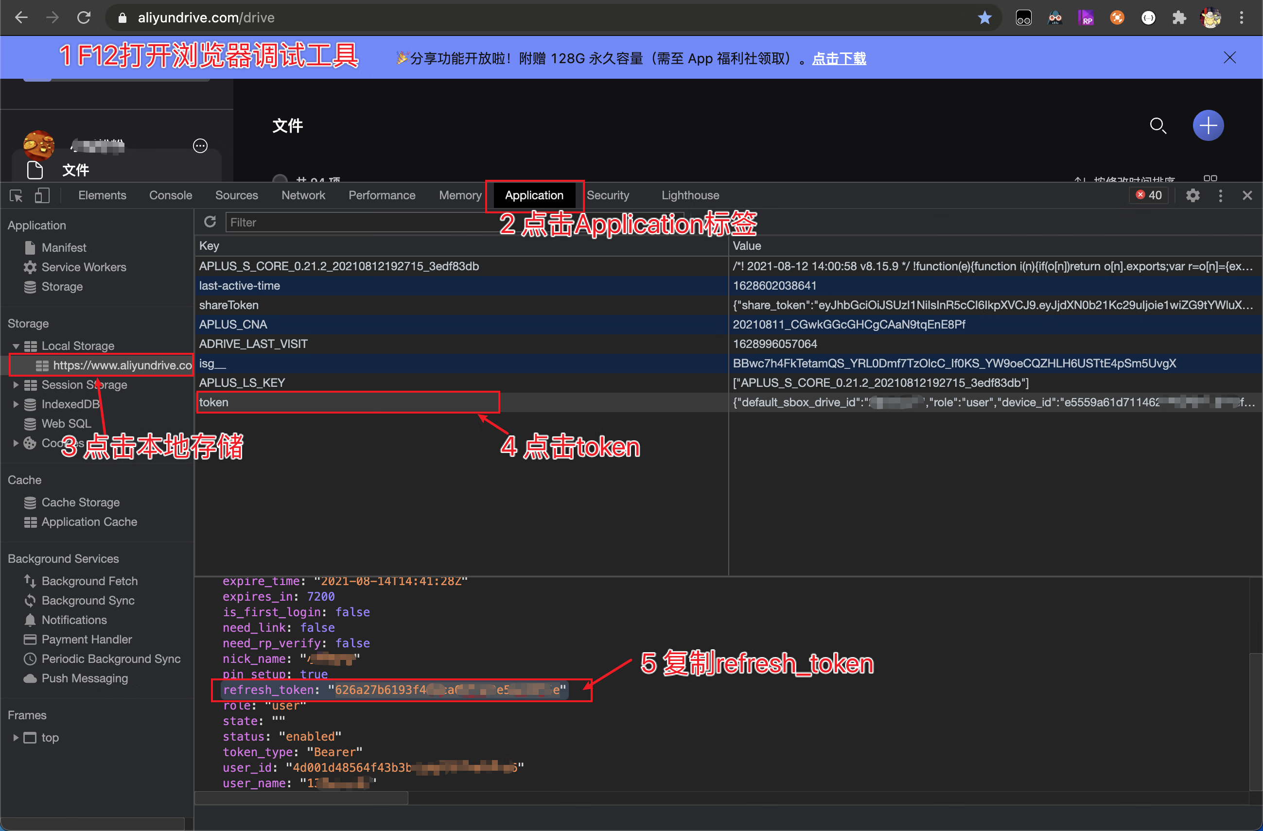 然后需要输入RefreshToken,获取这个RefreshToken需要进到阿里云盘官网并登录,按照下方图片操作