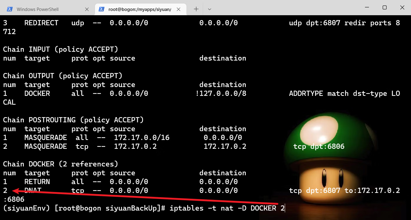 1. 如果需要让6807->6806的docker规则永久删除,可以在配置文件中将这条规则注释掉,这样再重启iptables都不会使其生效了