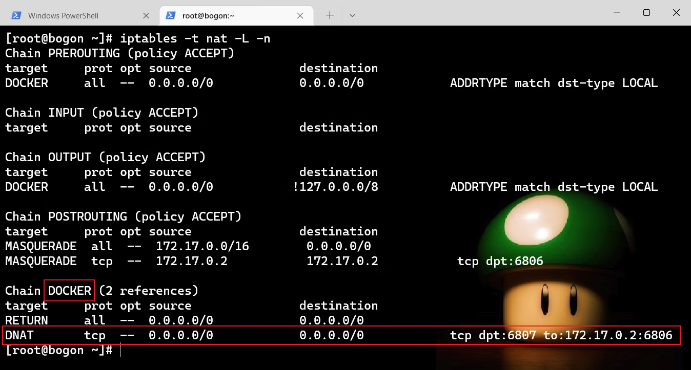 不过,如果是重启了容器,规则还是会被覆盖生效,这是无可避免的,除非再写一条规则,把docker映射的6807端口映射到其他端口