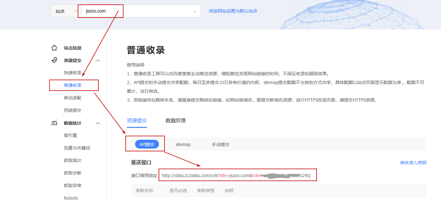 找到config.baiduPush字段配置接口调用地址,登录百度站长管理平台,找到如下接口地址
