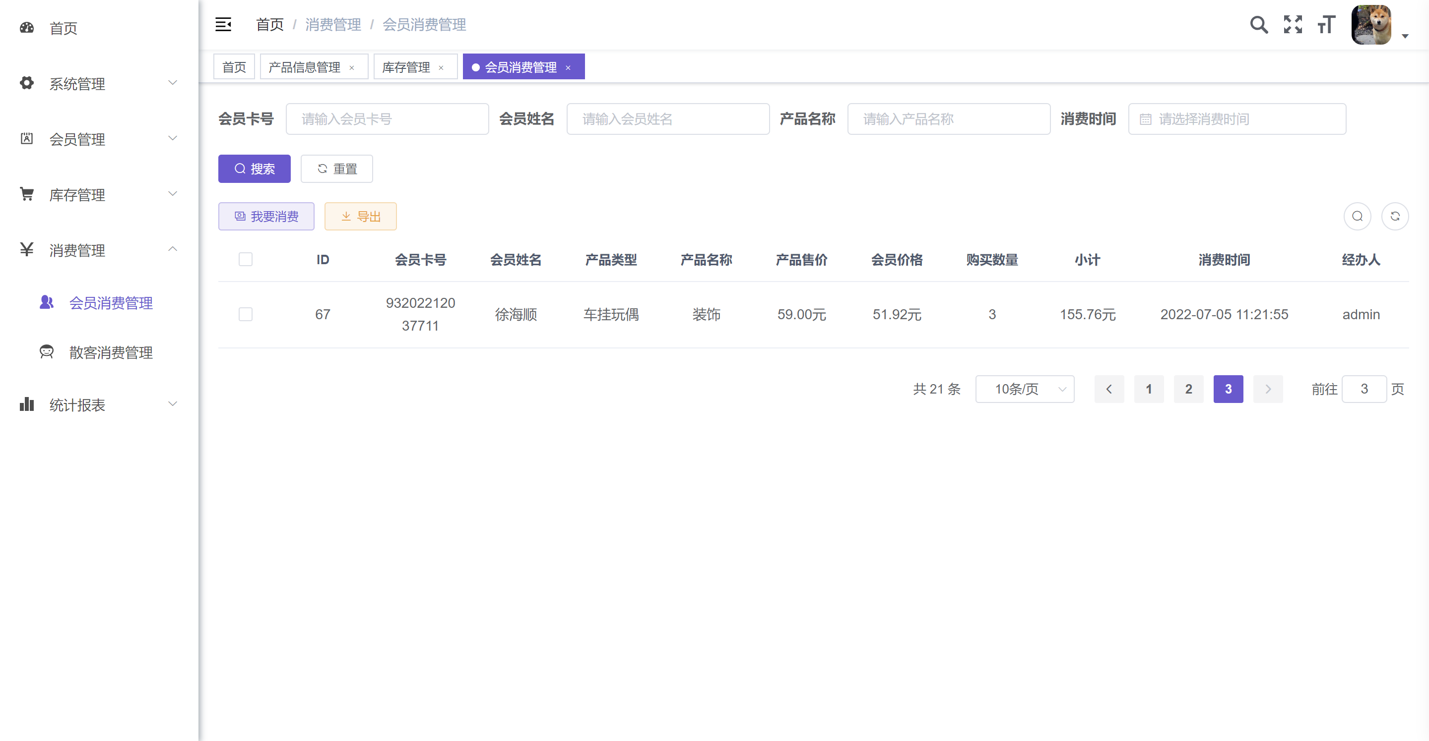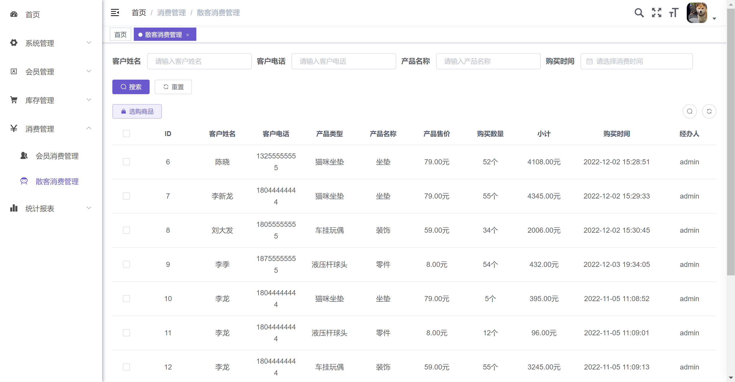 7. 散客消费管理:未注册会员用户使用,直接消费并扣除库存。