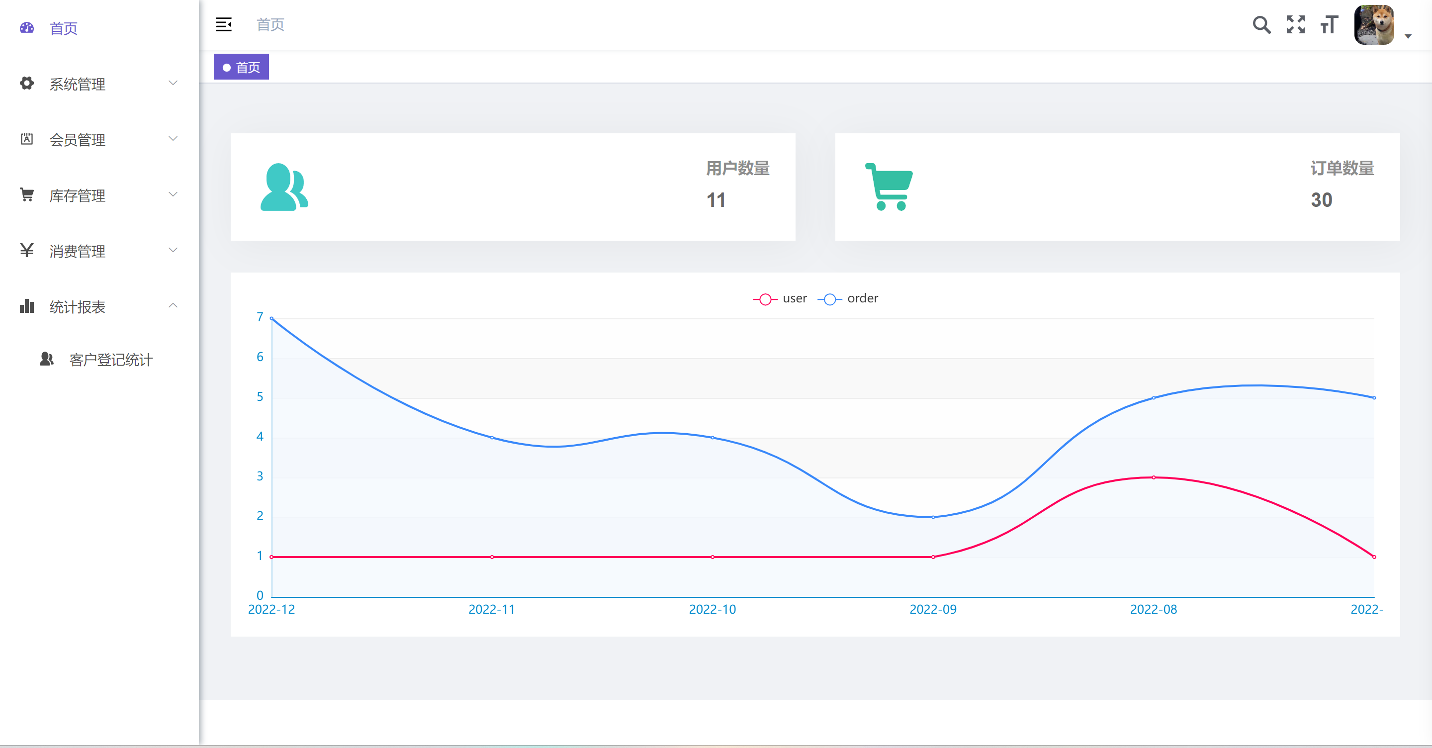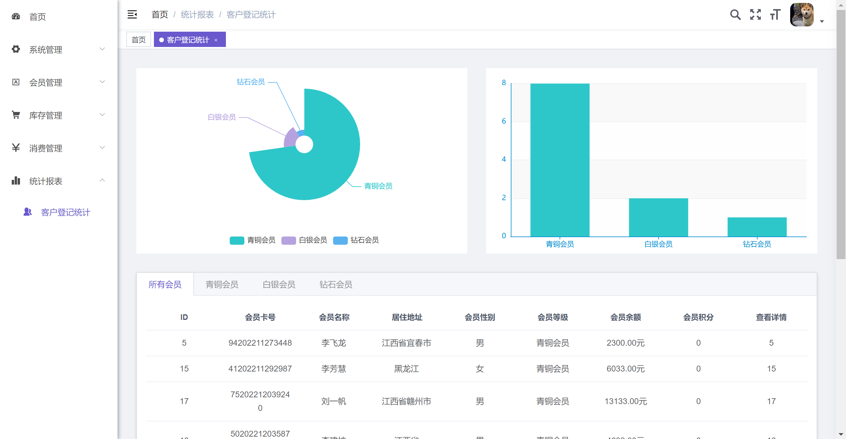 8. 客户登记统计:Echart图展示会员人数和等级分布概况。